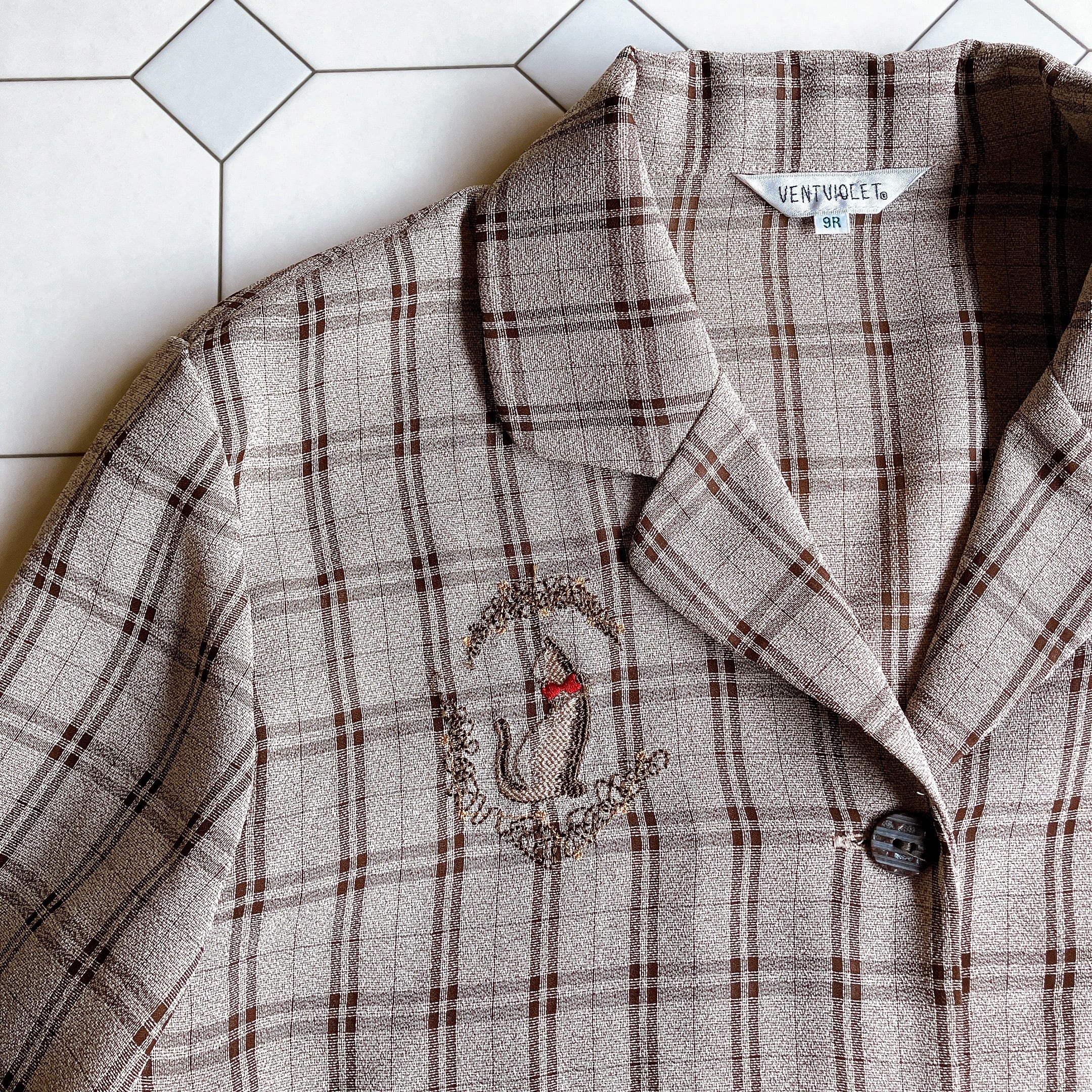 used レトロ 猫刺繍 チェックブラウス 古着 ヴィンテージ vintage