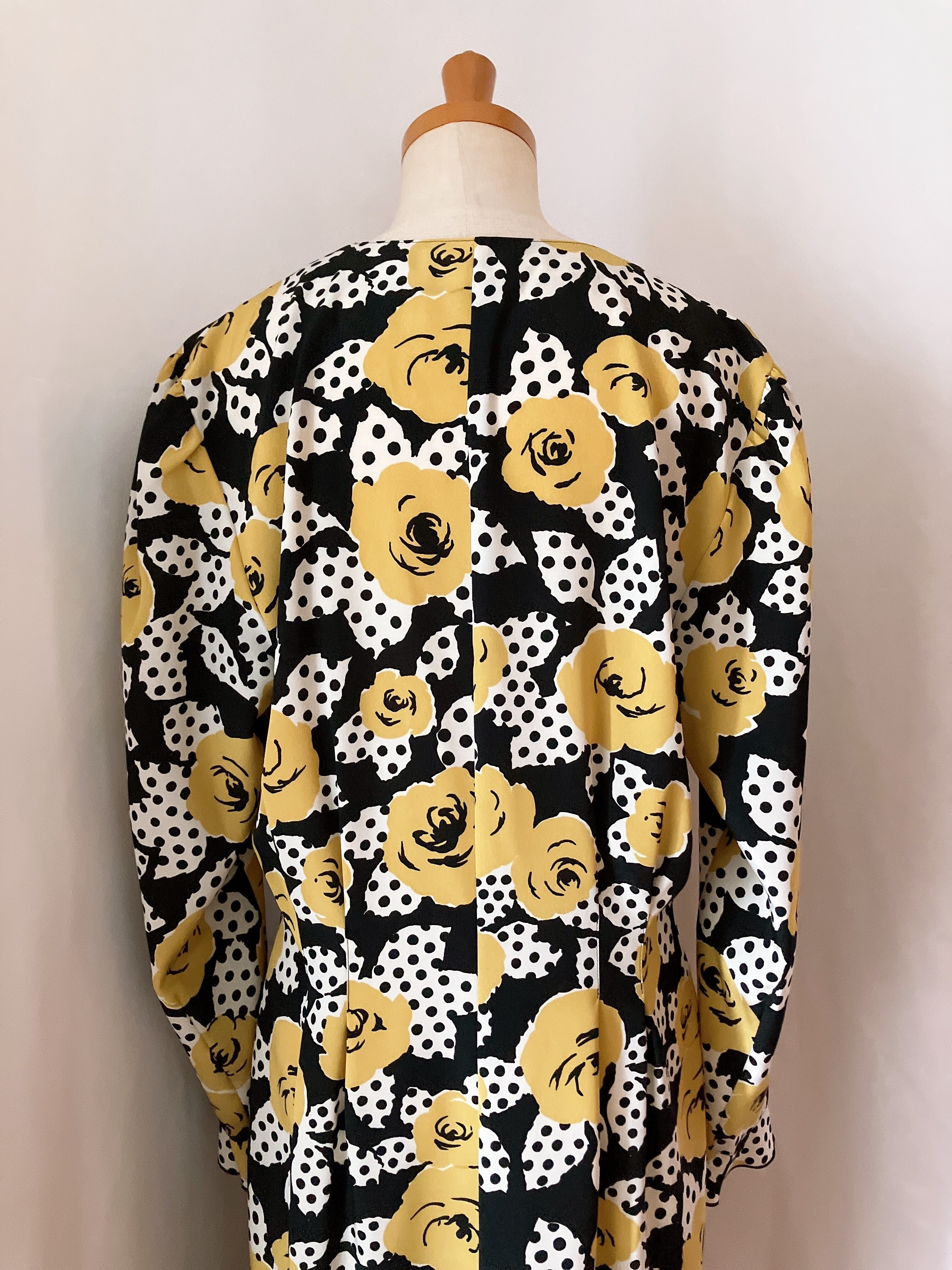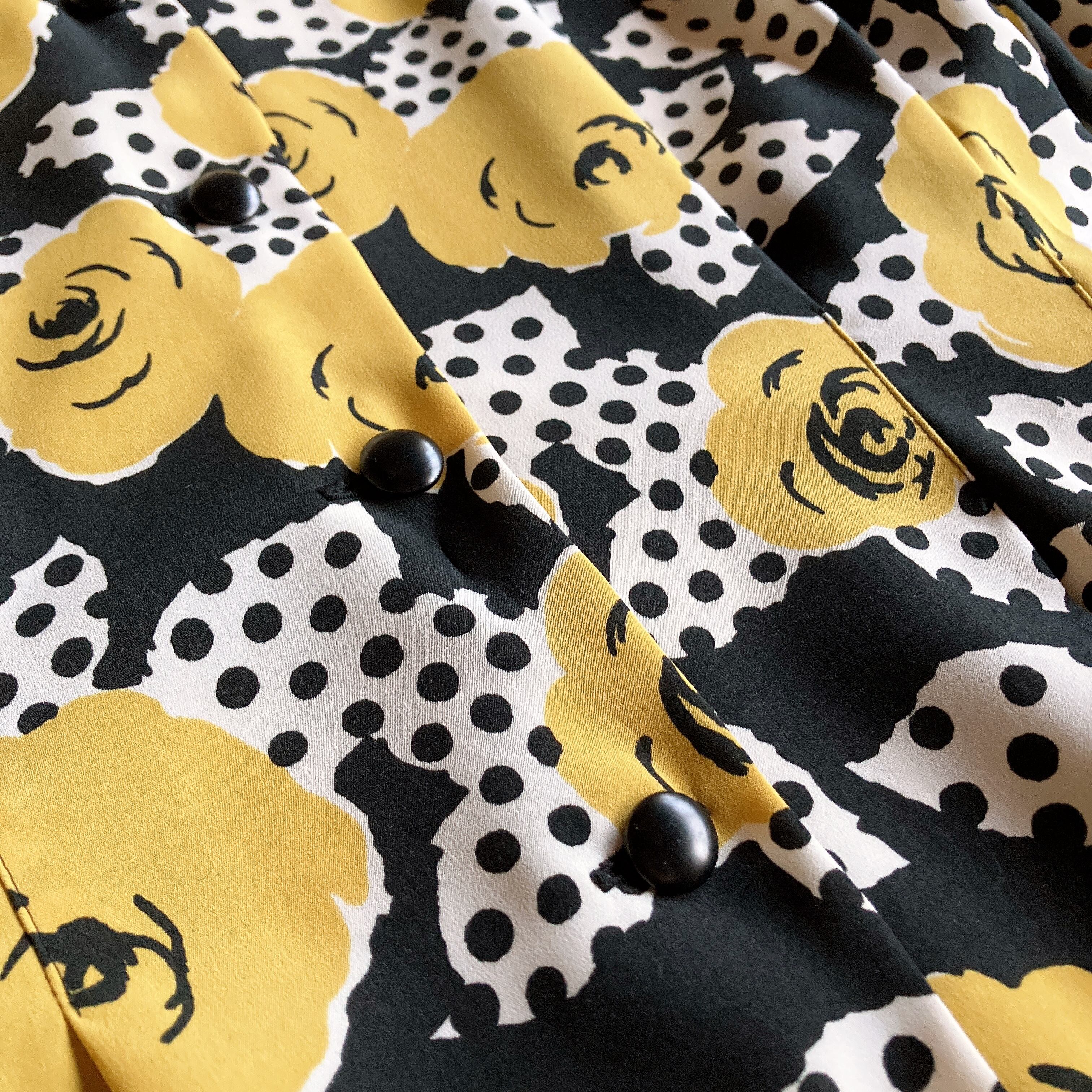 黒地に大きな黄色の花柄と水玉模様が組み合わさった、