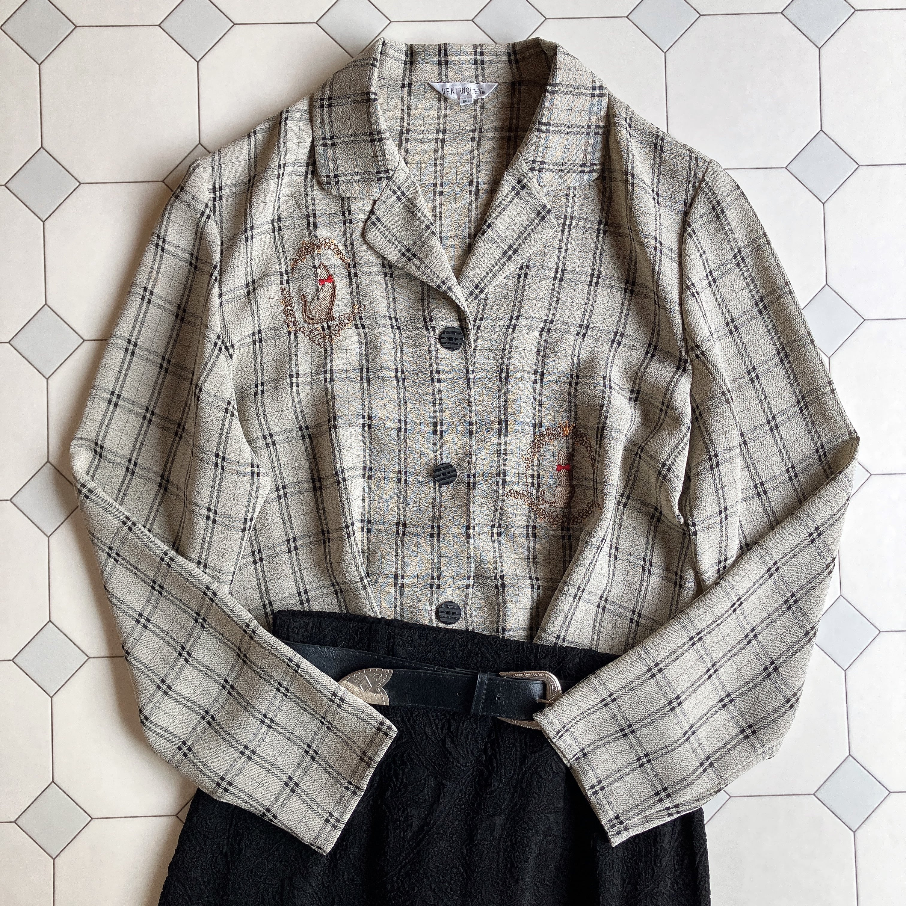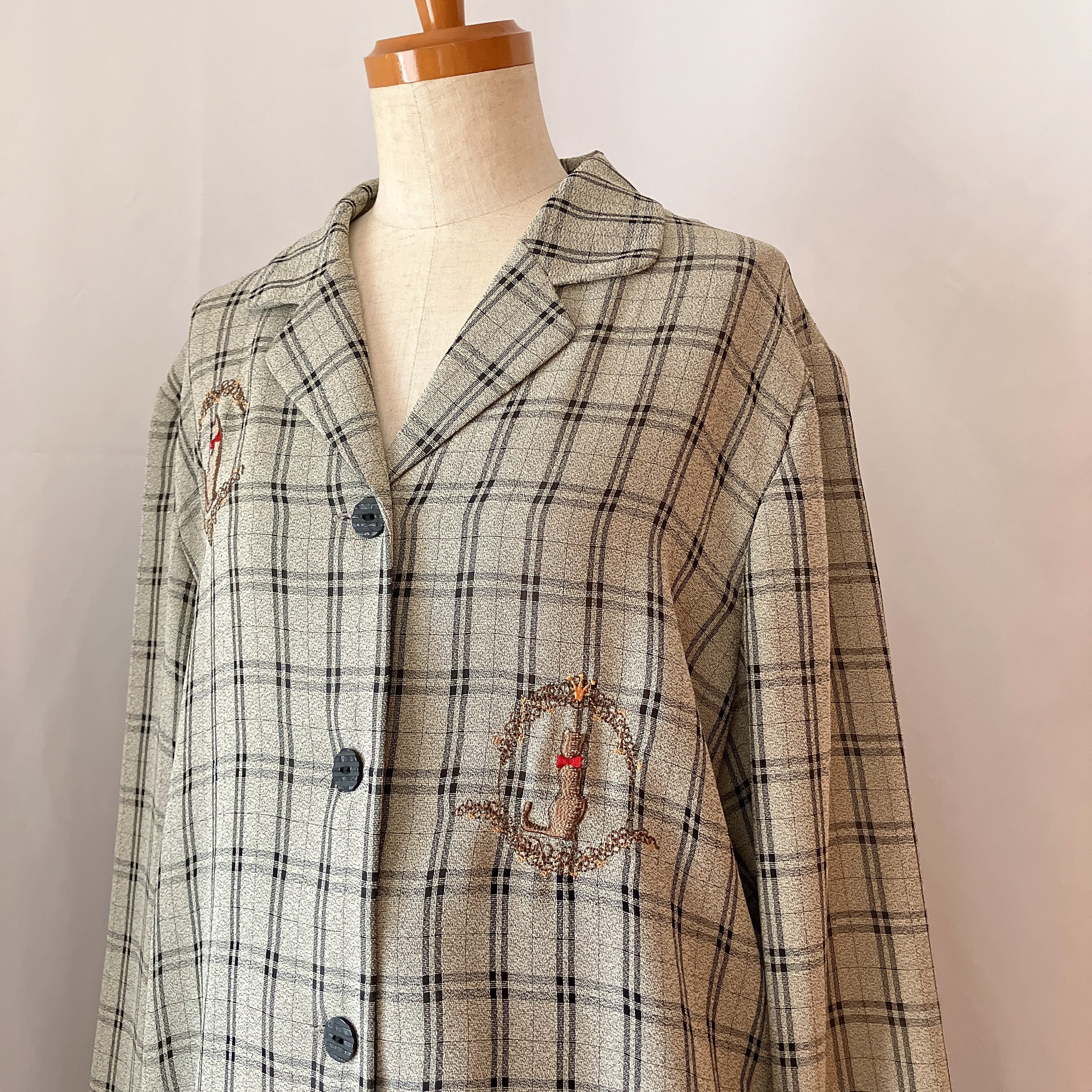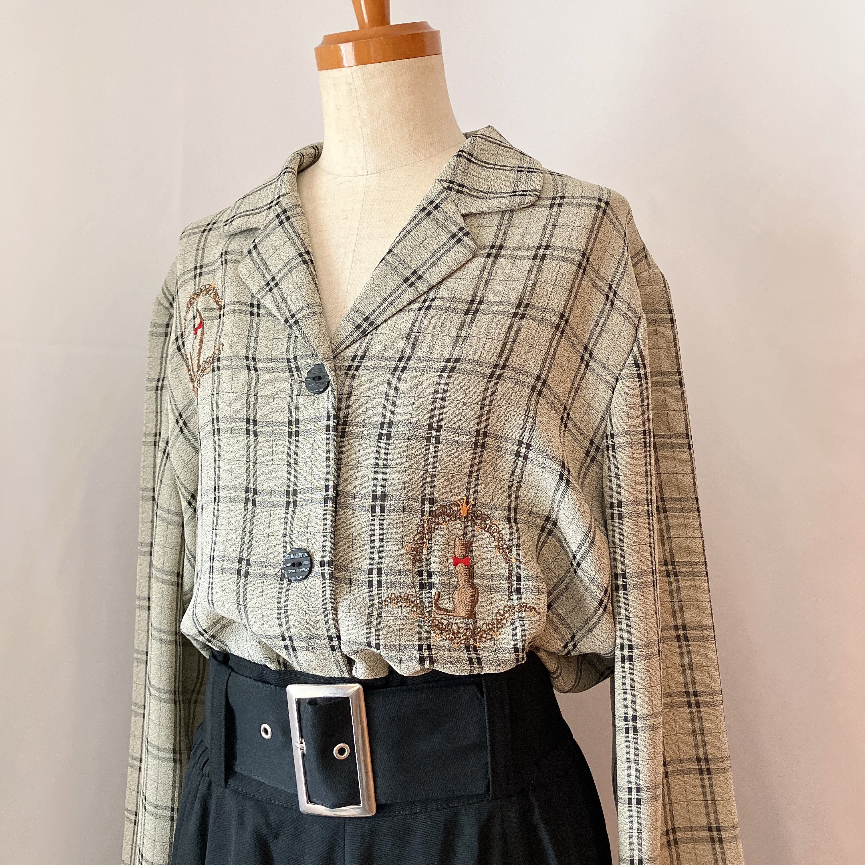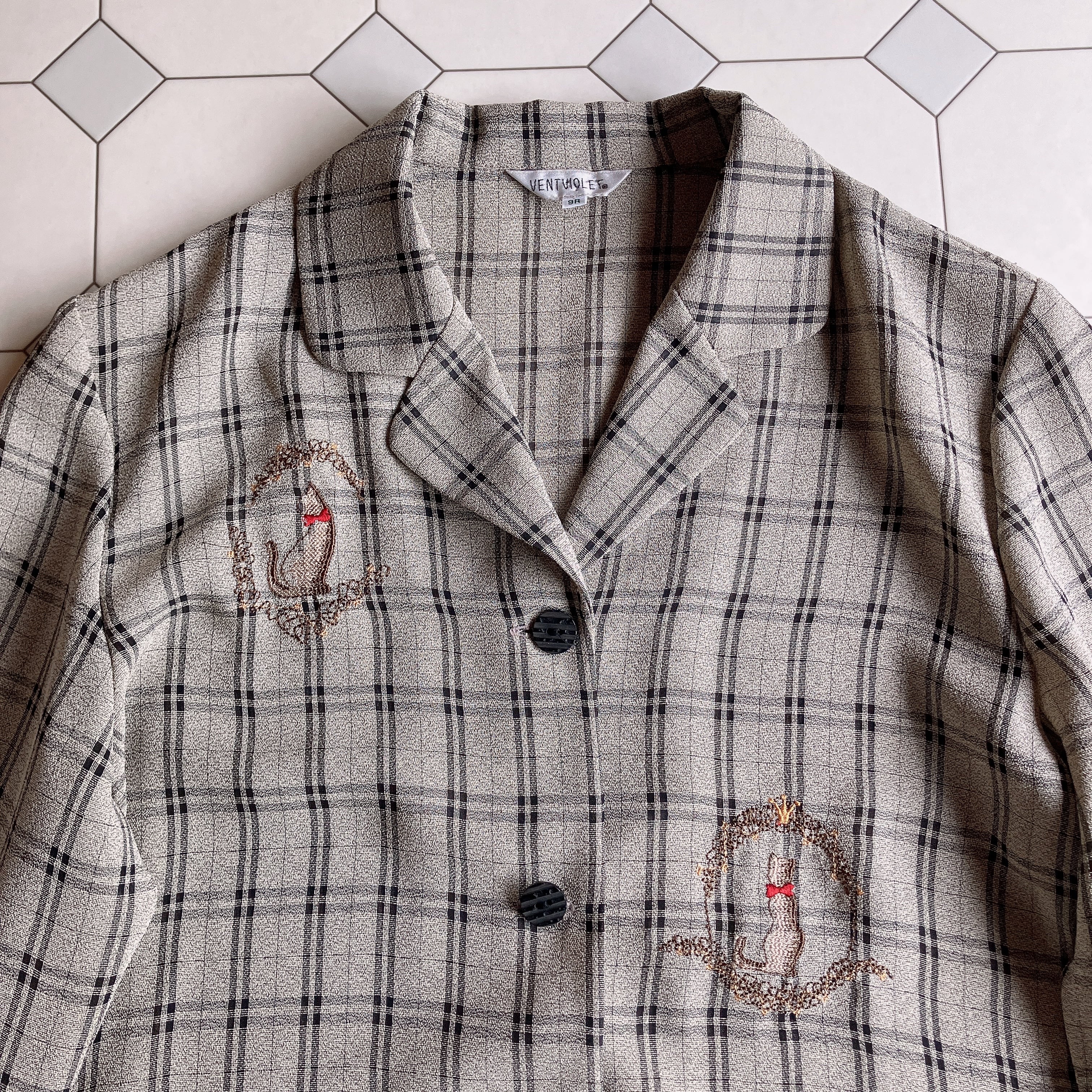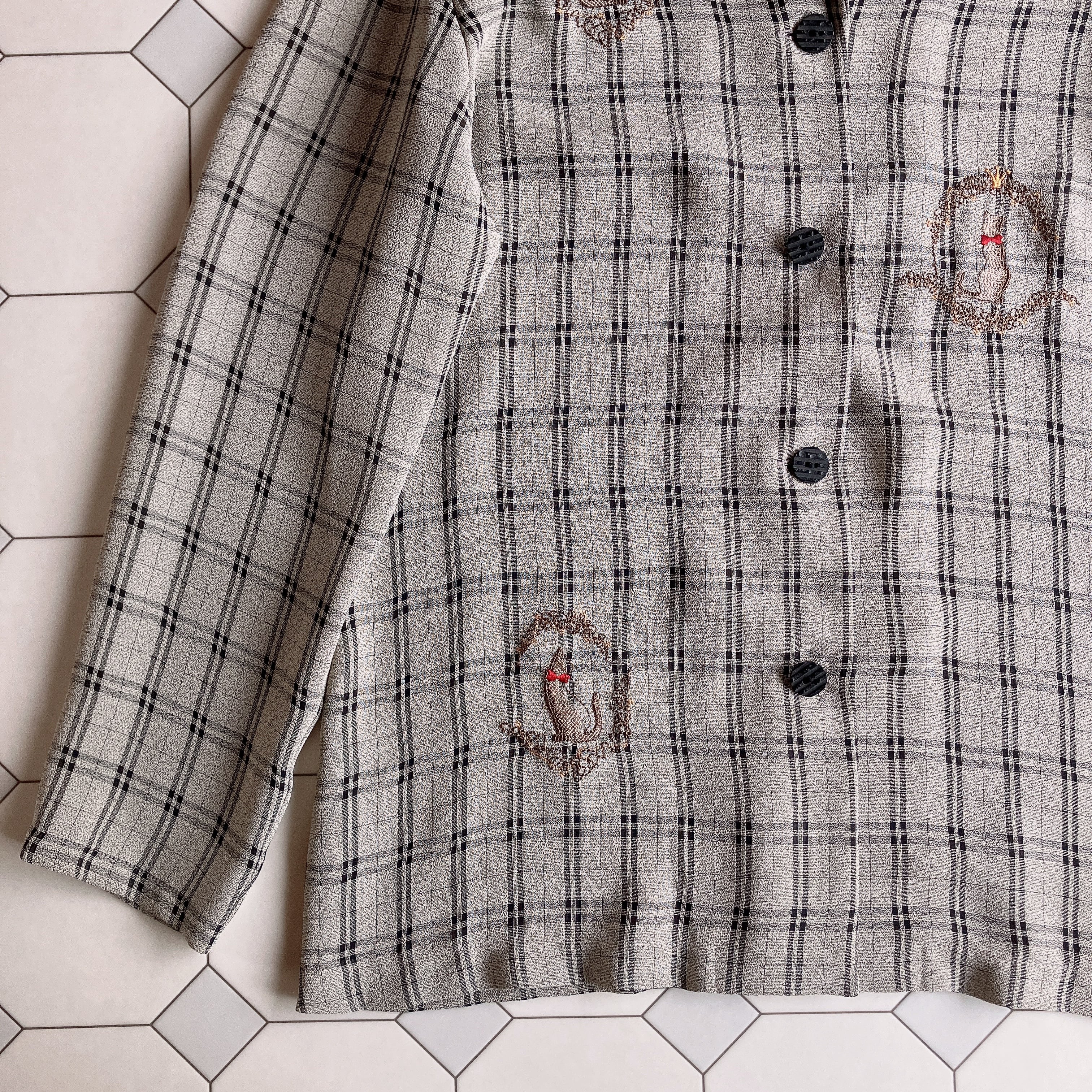 used レトロ 猫刺繍 チェック ブラウス 古着 ヴィンテージ vintage