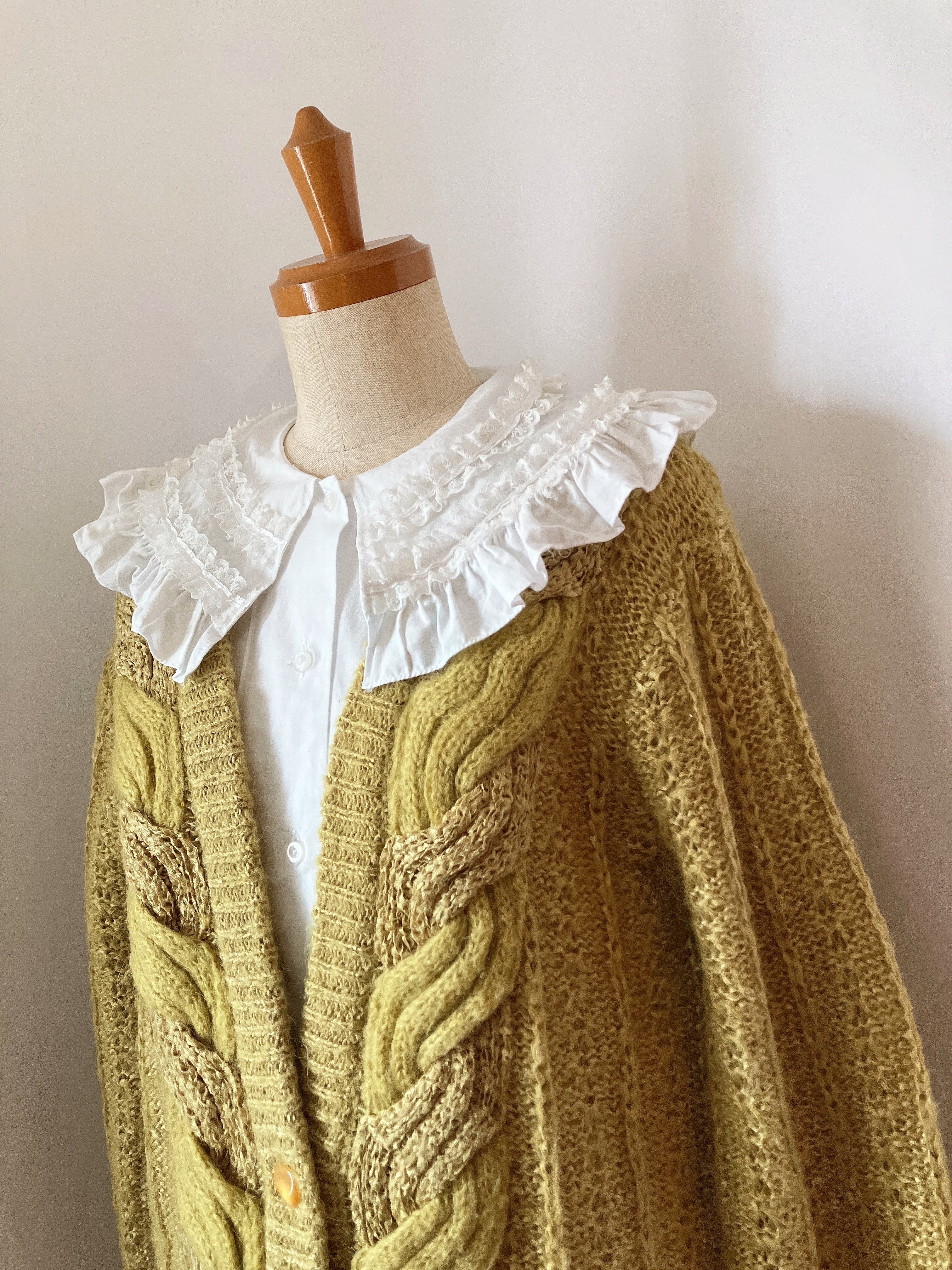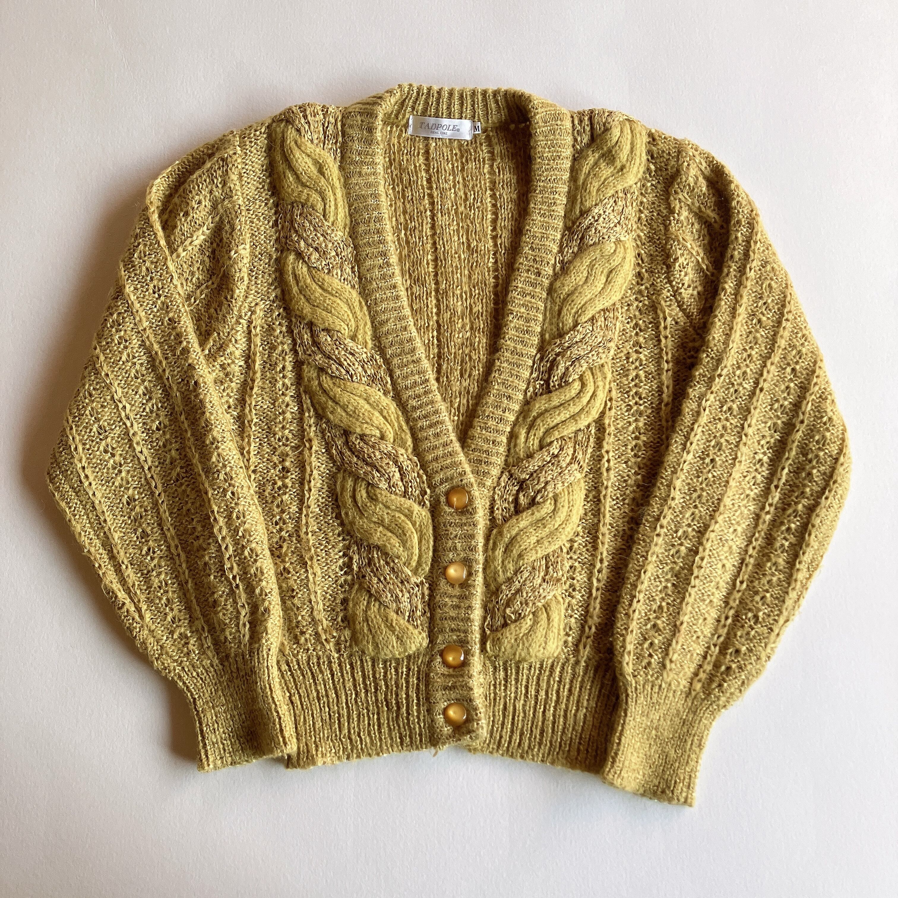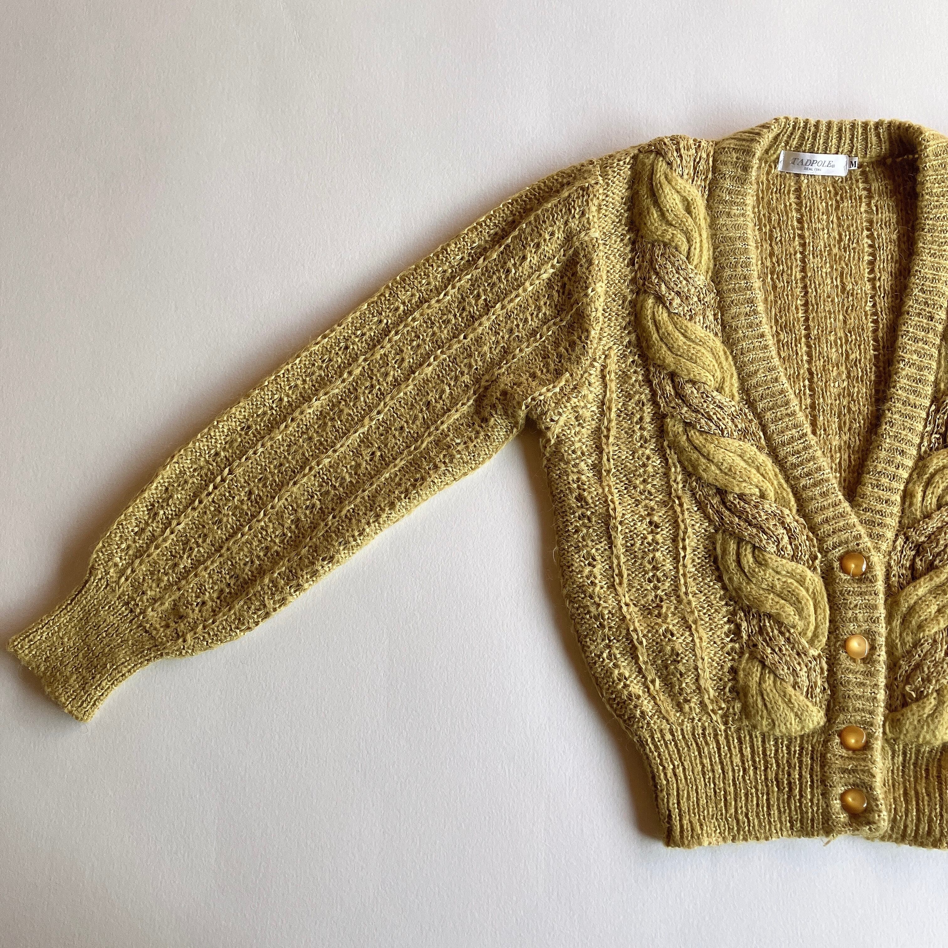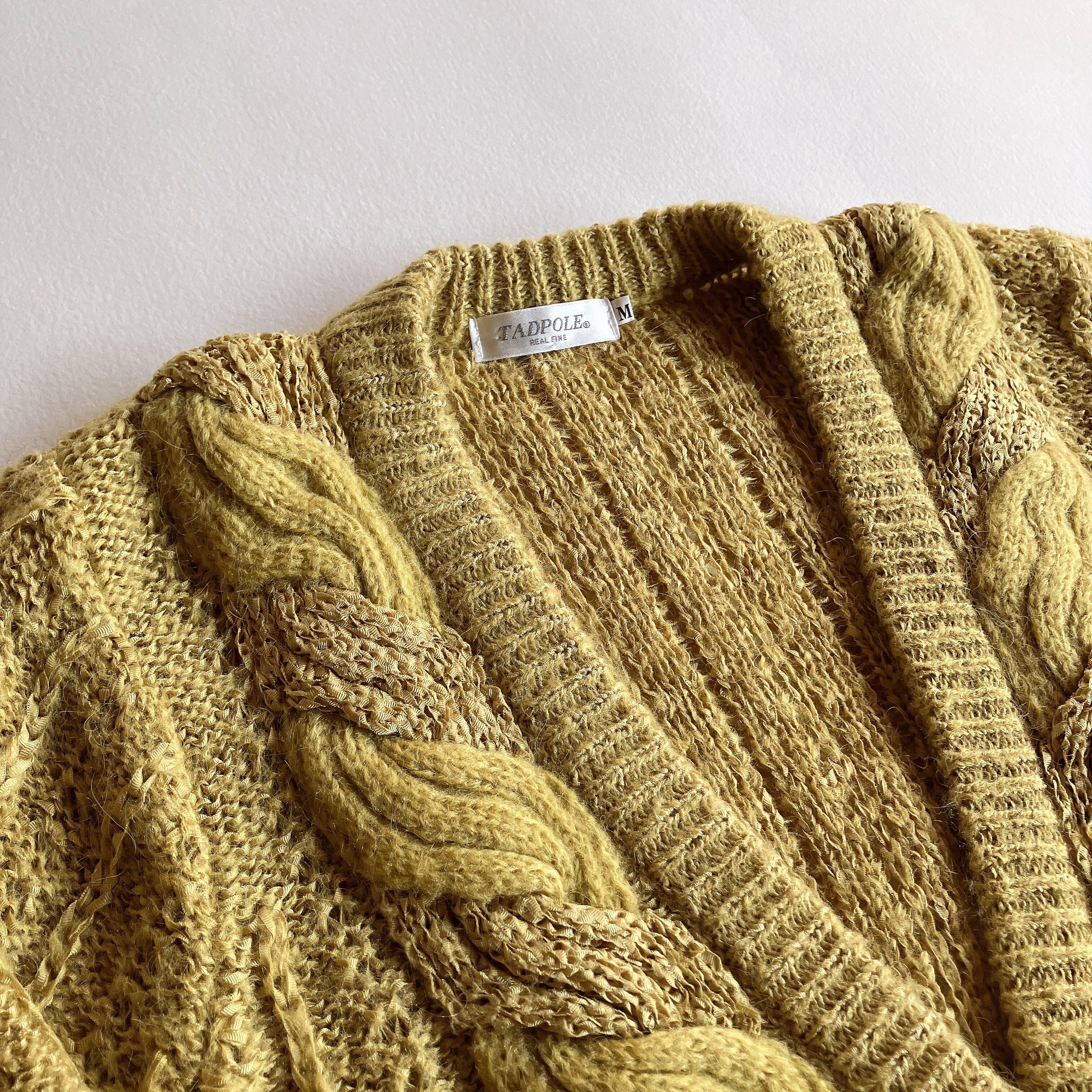 used レトロ 黄色 ケーブル編みニットカーデ古着 ヴィンテージvintage
