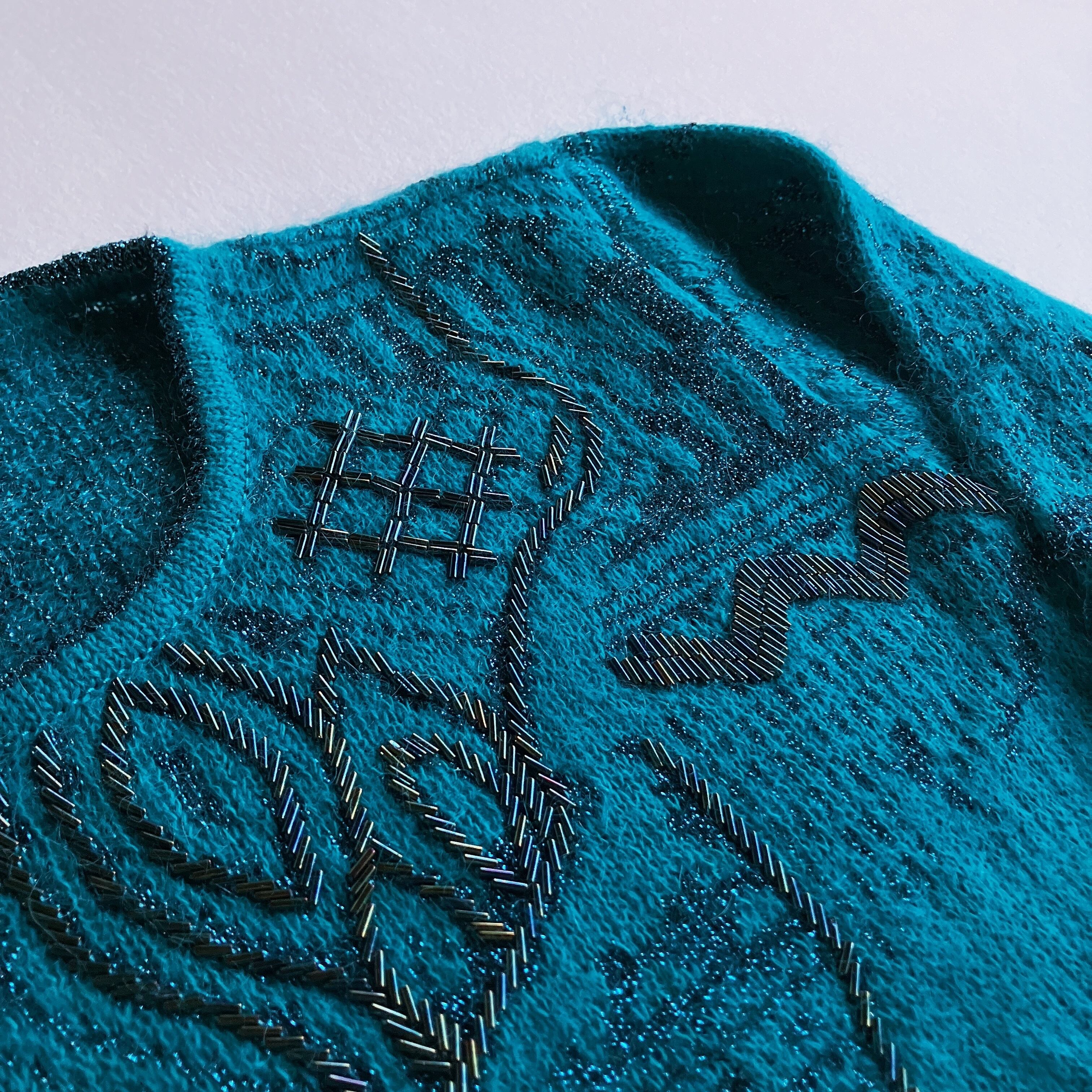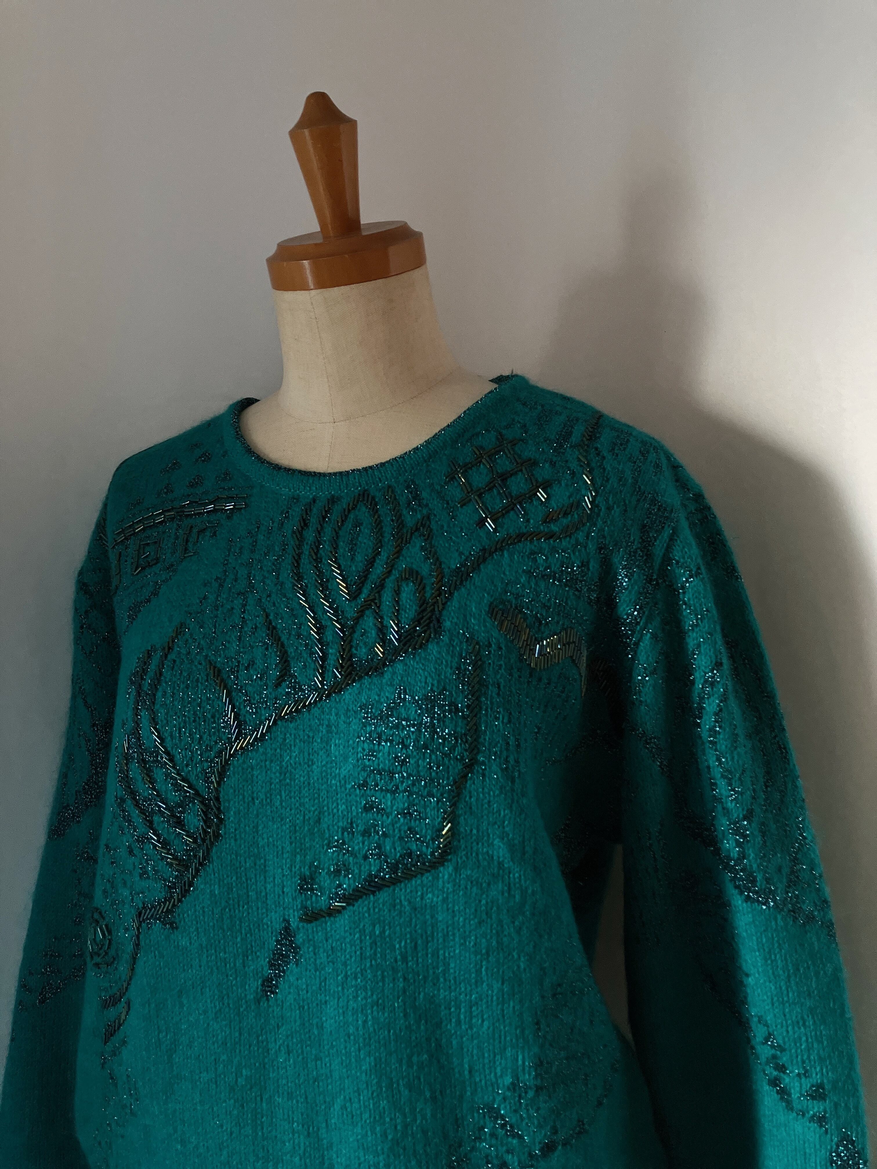 used レトロ 青緑 ビーズ刺繍 ニット 古着 ヴィンテージ vintage