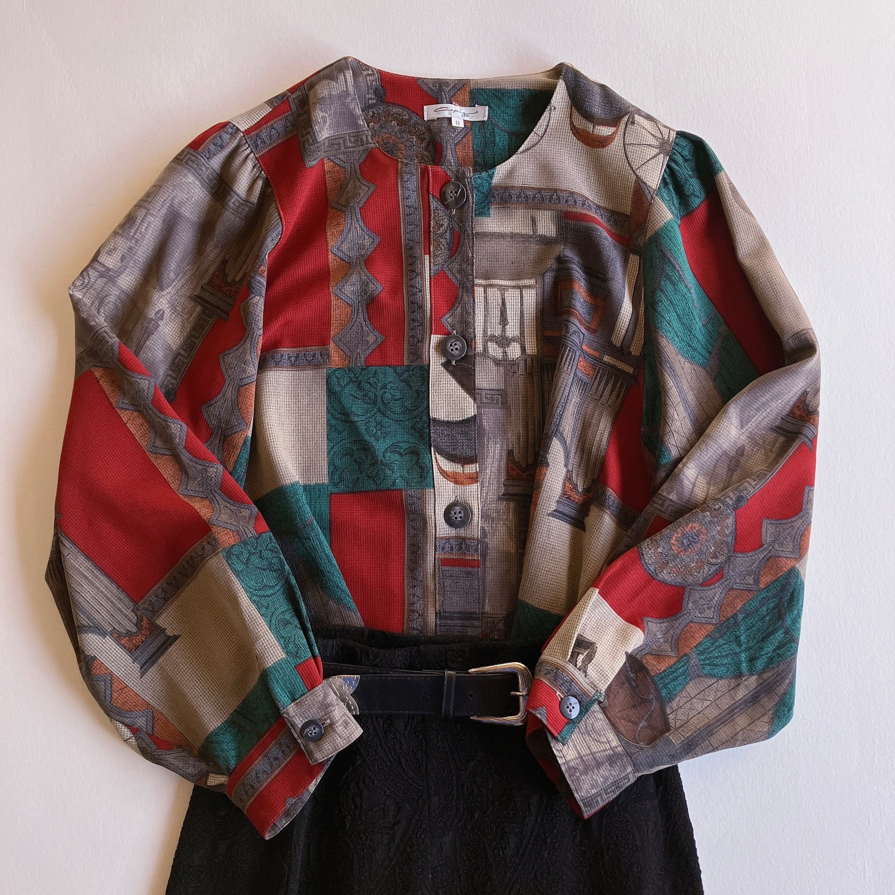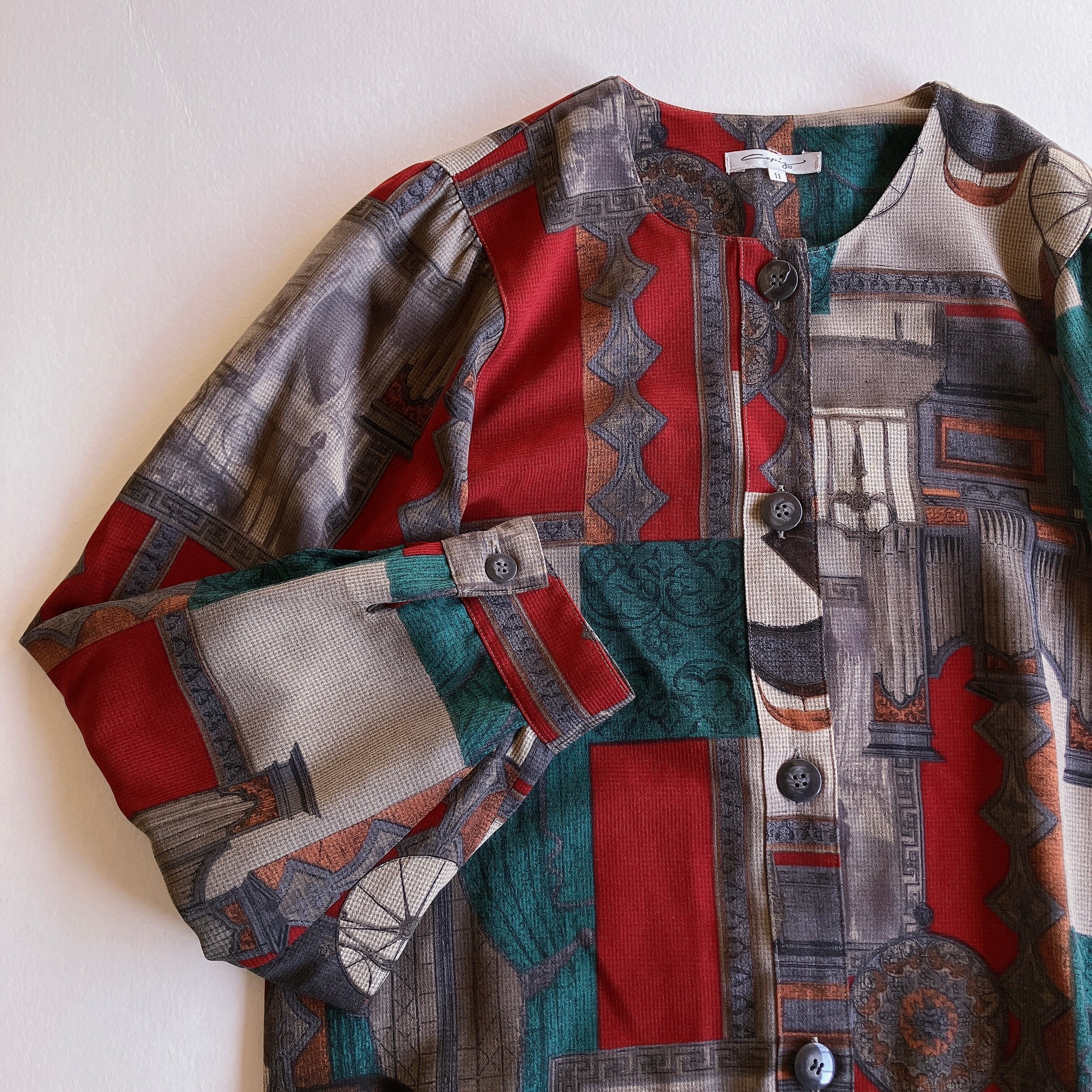 used レトロ 幾何学模様ノーカラーブラウス古着 ヴィンテージ vintage
