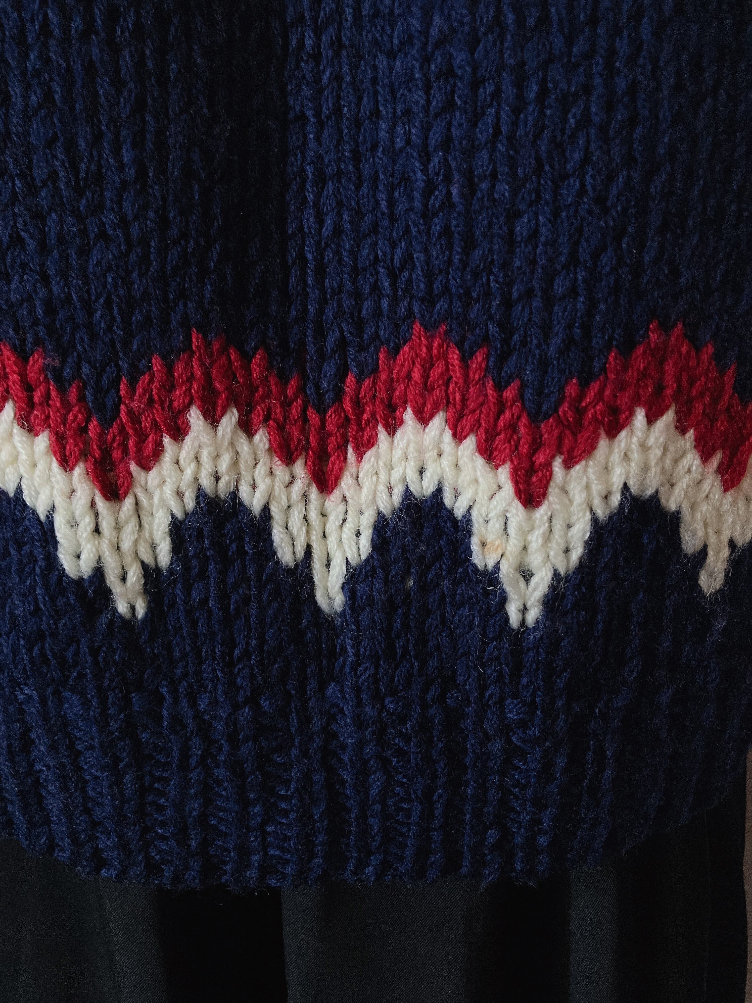 ネイビーをベースに、レッド × アイボリーの北欧風パターンが映えるデザインで、冬の主役アイテムとして重宝します。