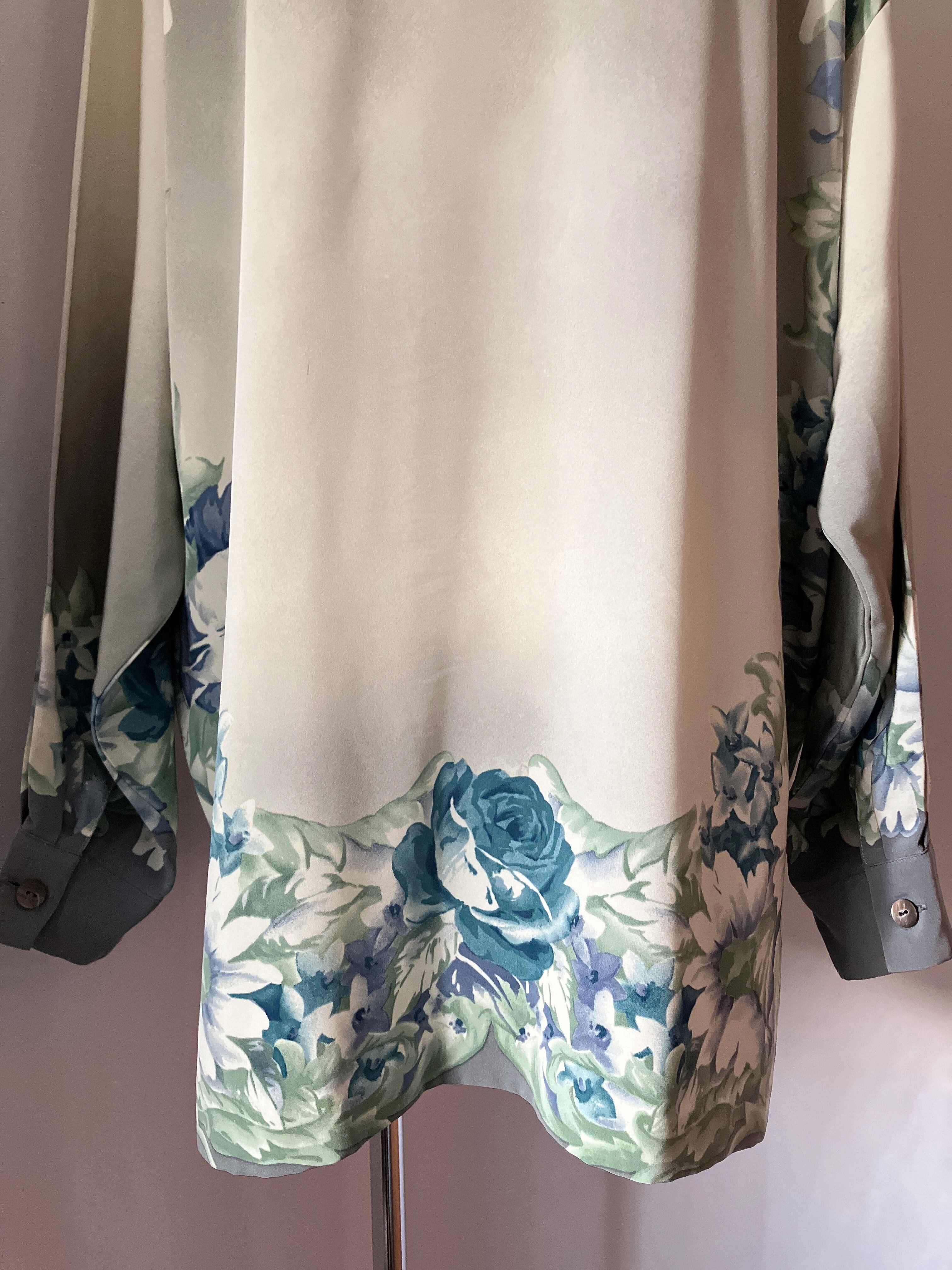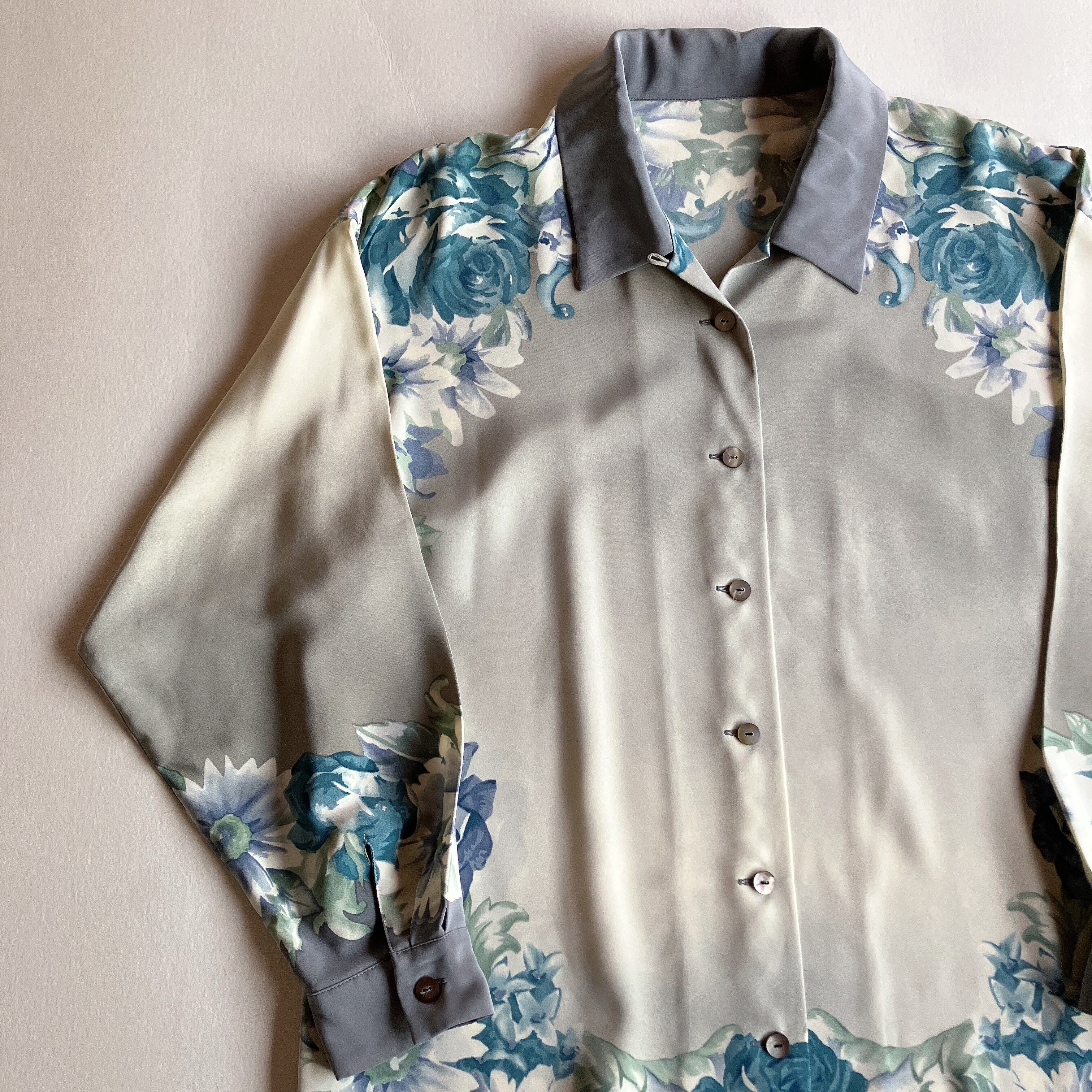 used レトロ グレーと青 花柄ブラウス 古着 ヴィンテージ vintage