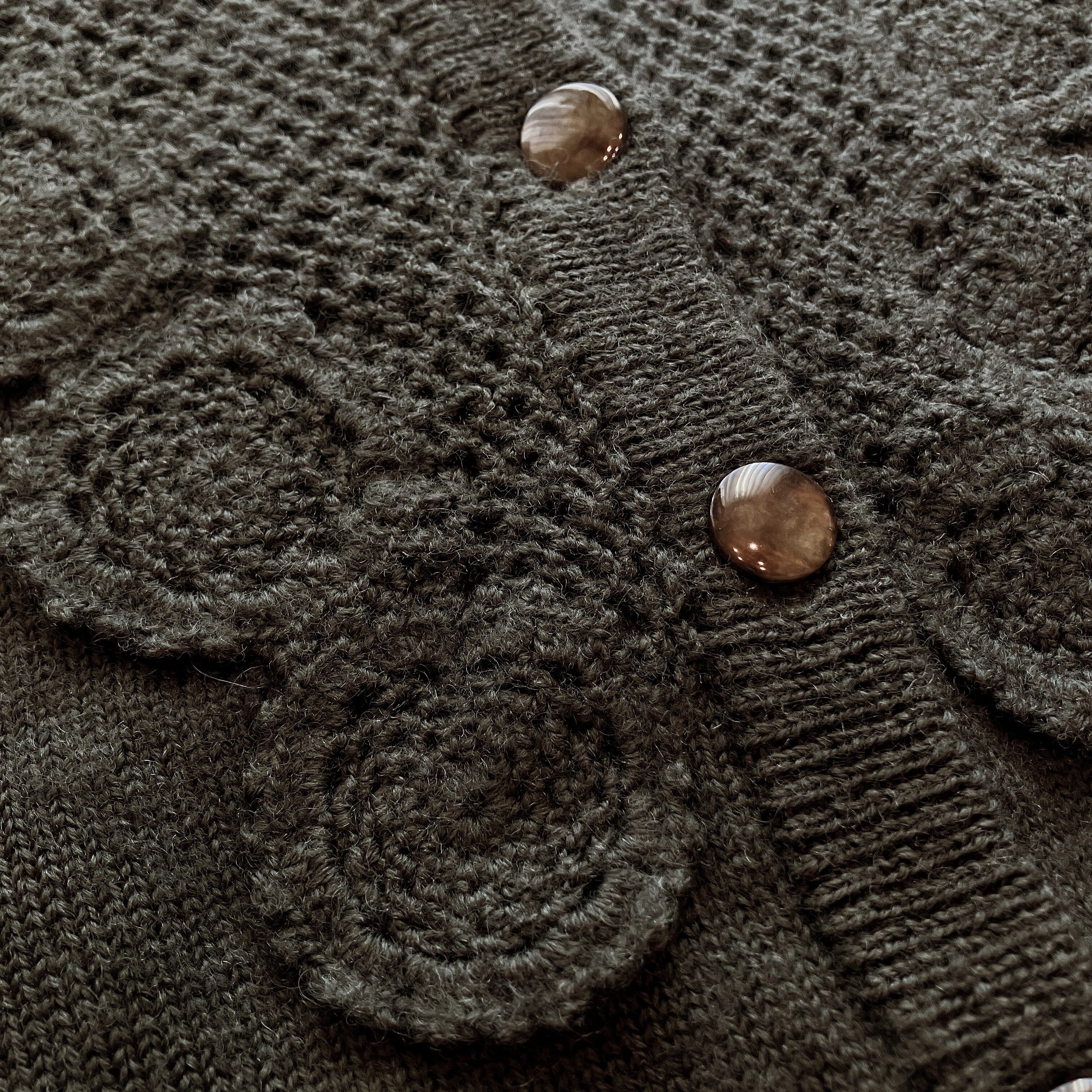 ヨーク部分には円形モチーフのクロシェ編みが施されており、
