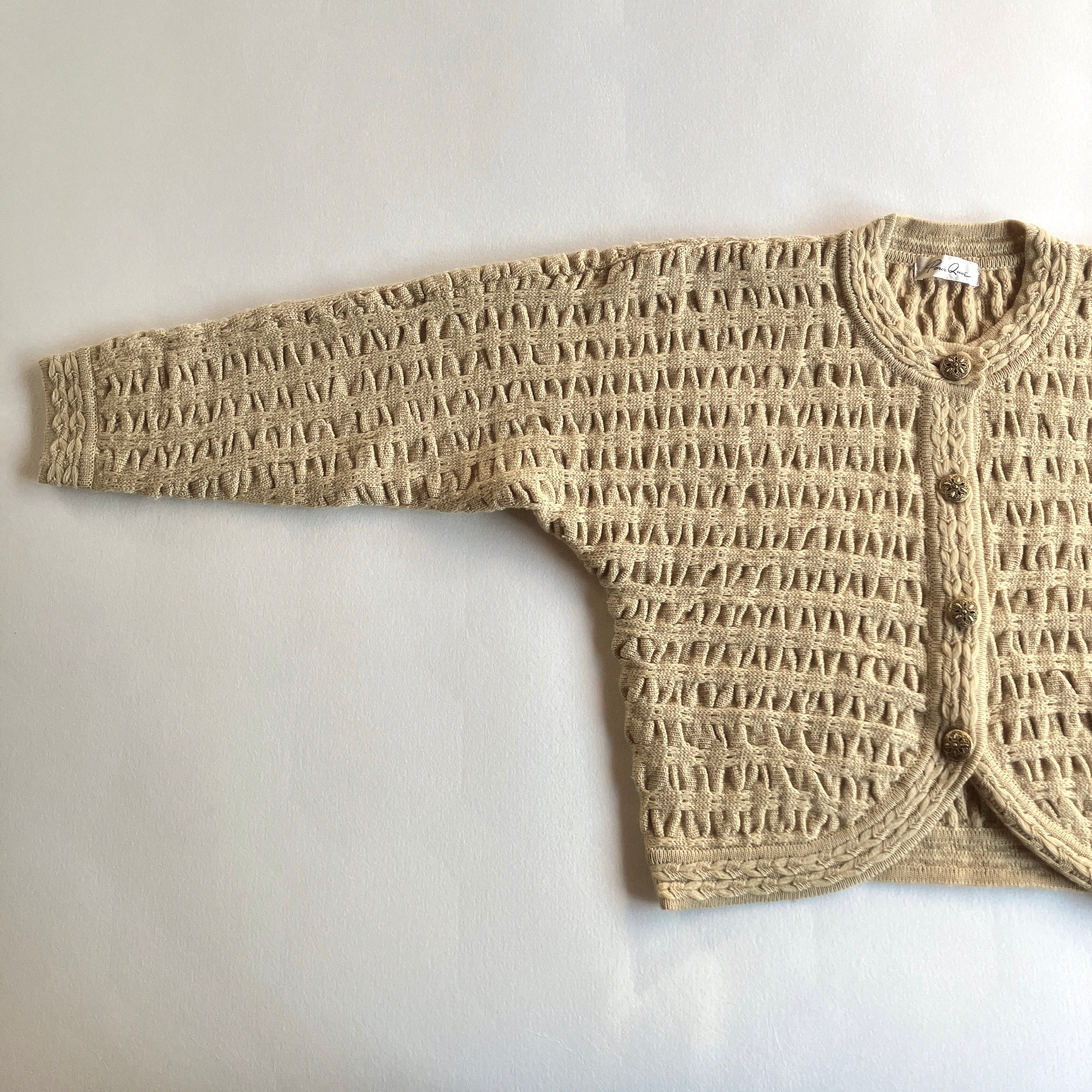 立体感のある編み模様と装飾ボタンがポイント。