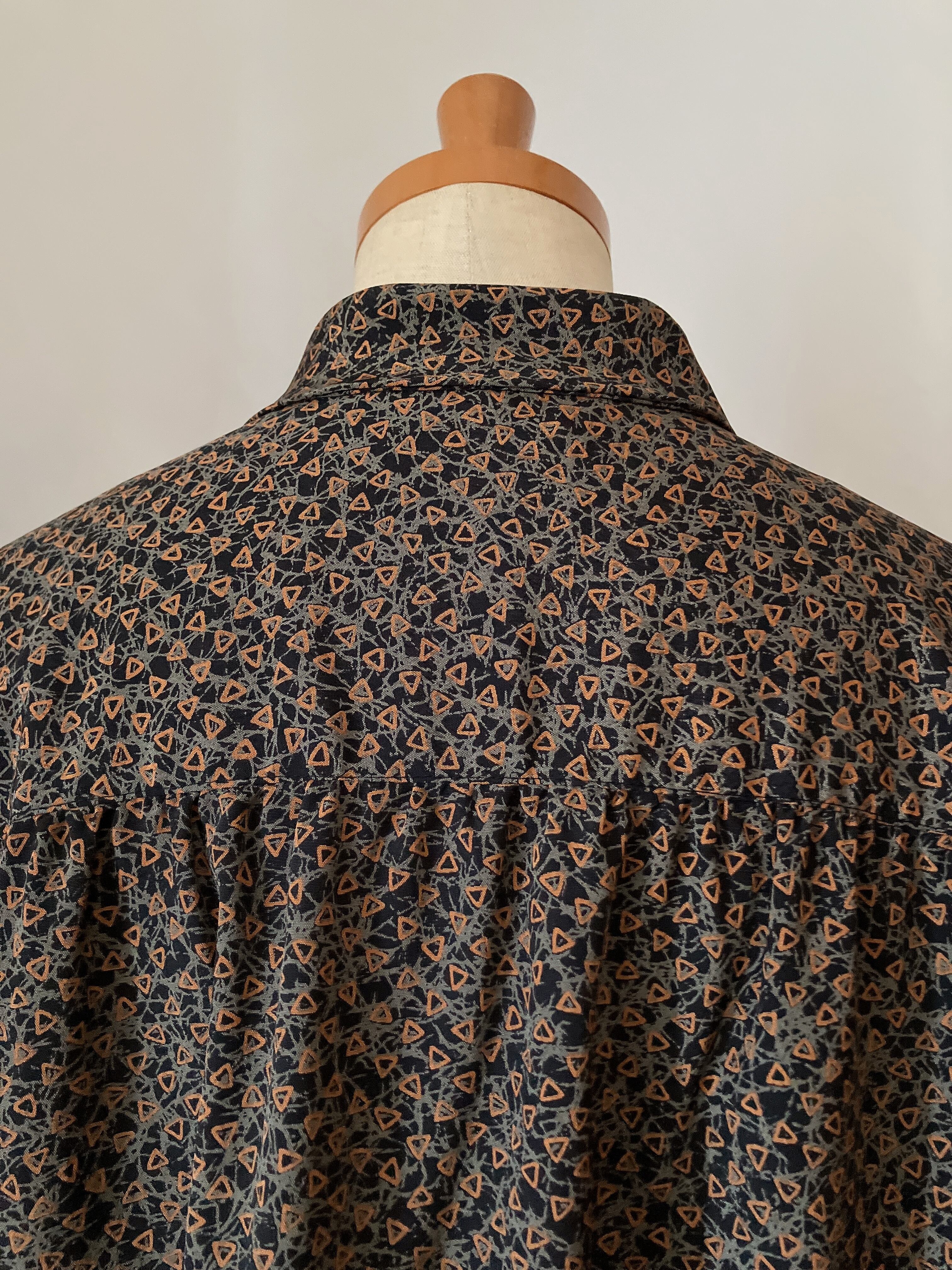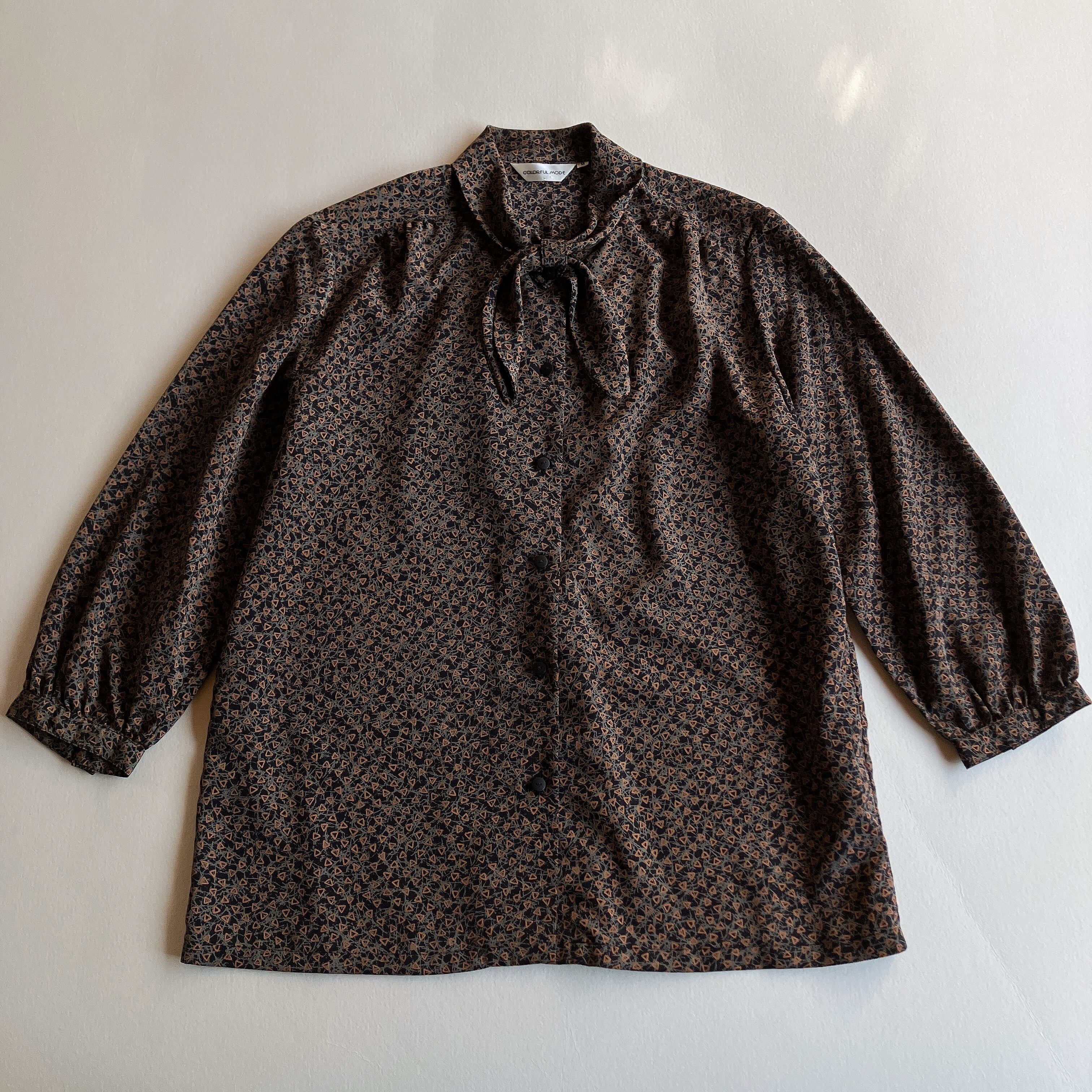 落ち着いた色合いに、細かな総柄が印象的なブラウスです。
