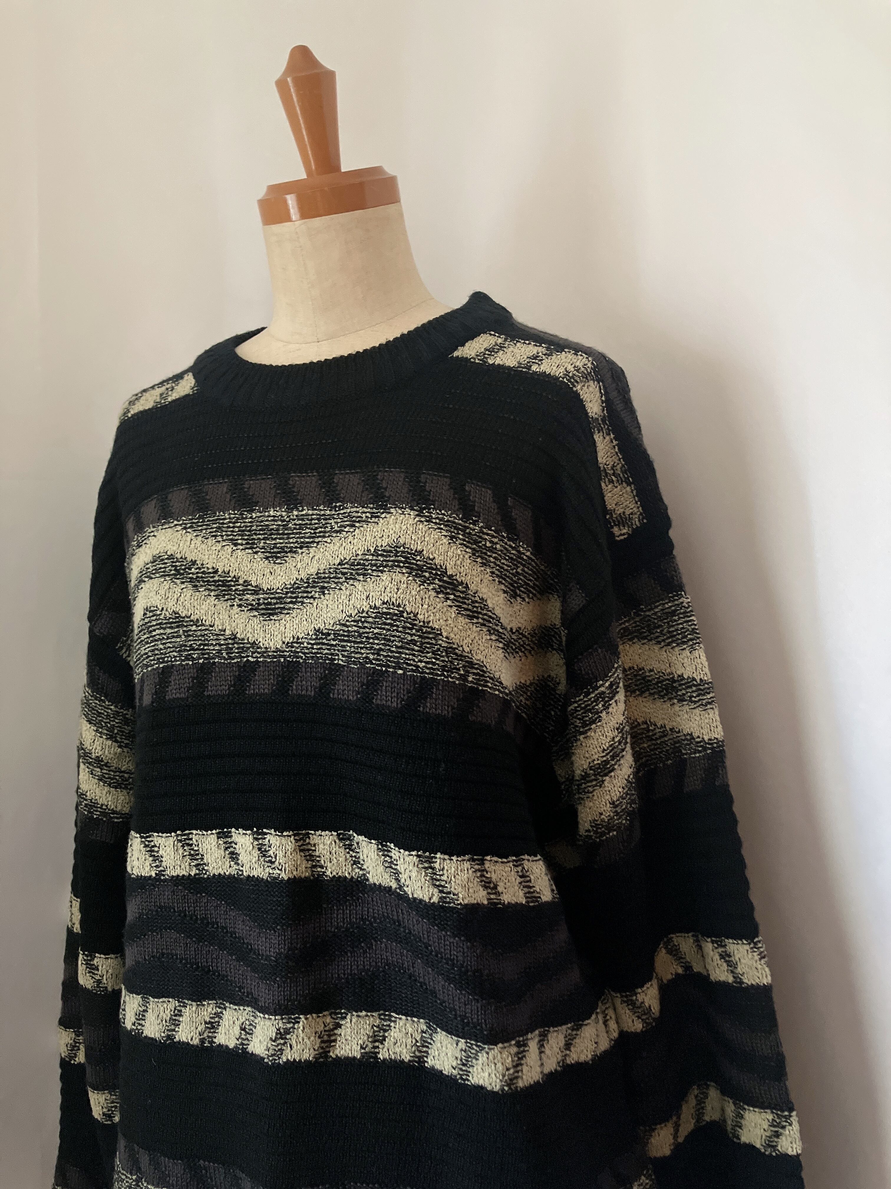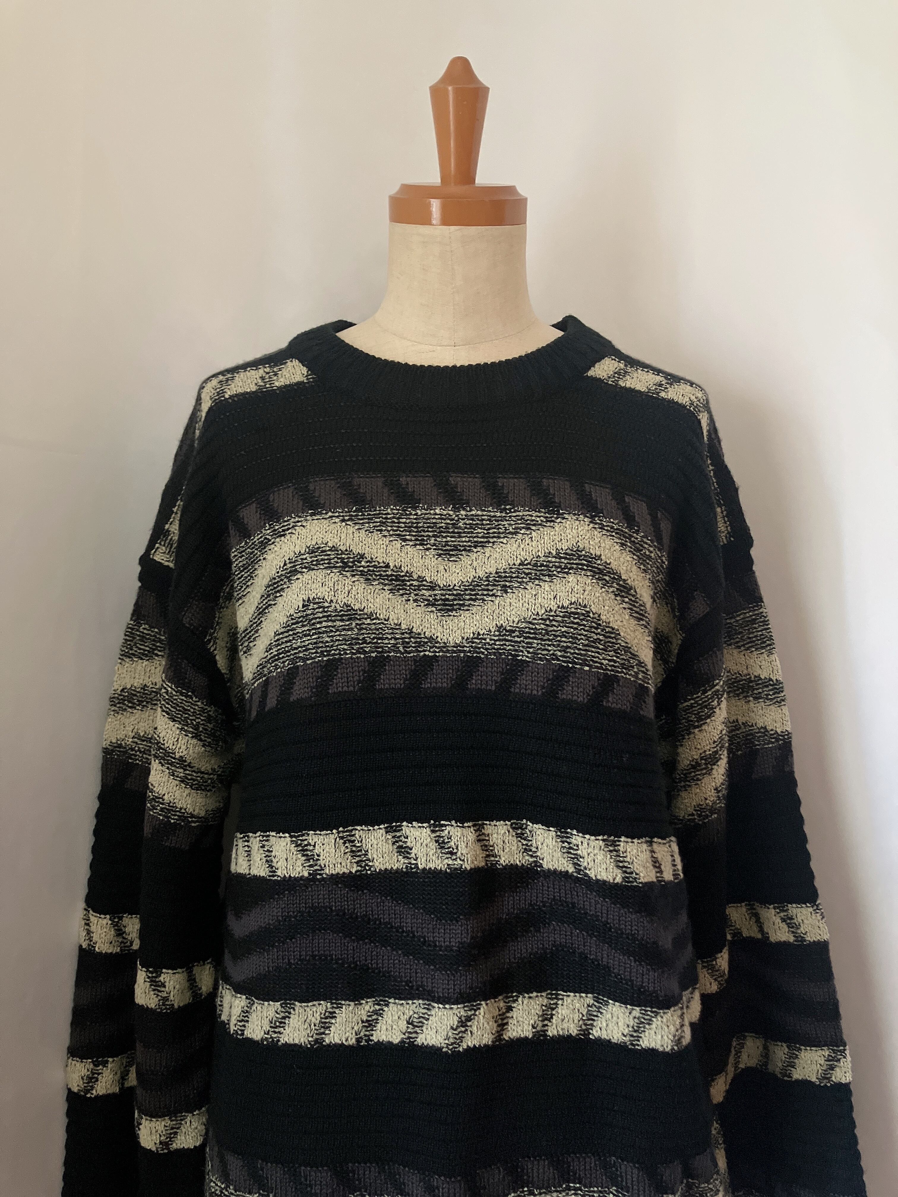 ブラックをベースに、ジグザグ柄やボーダー調の編み柄が組み合わさった、
