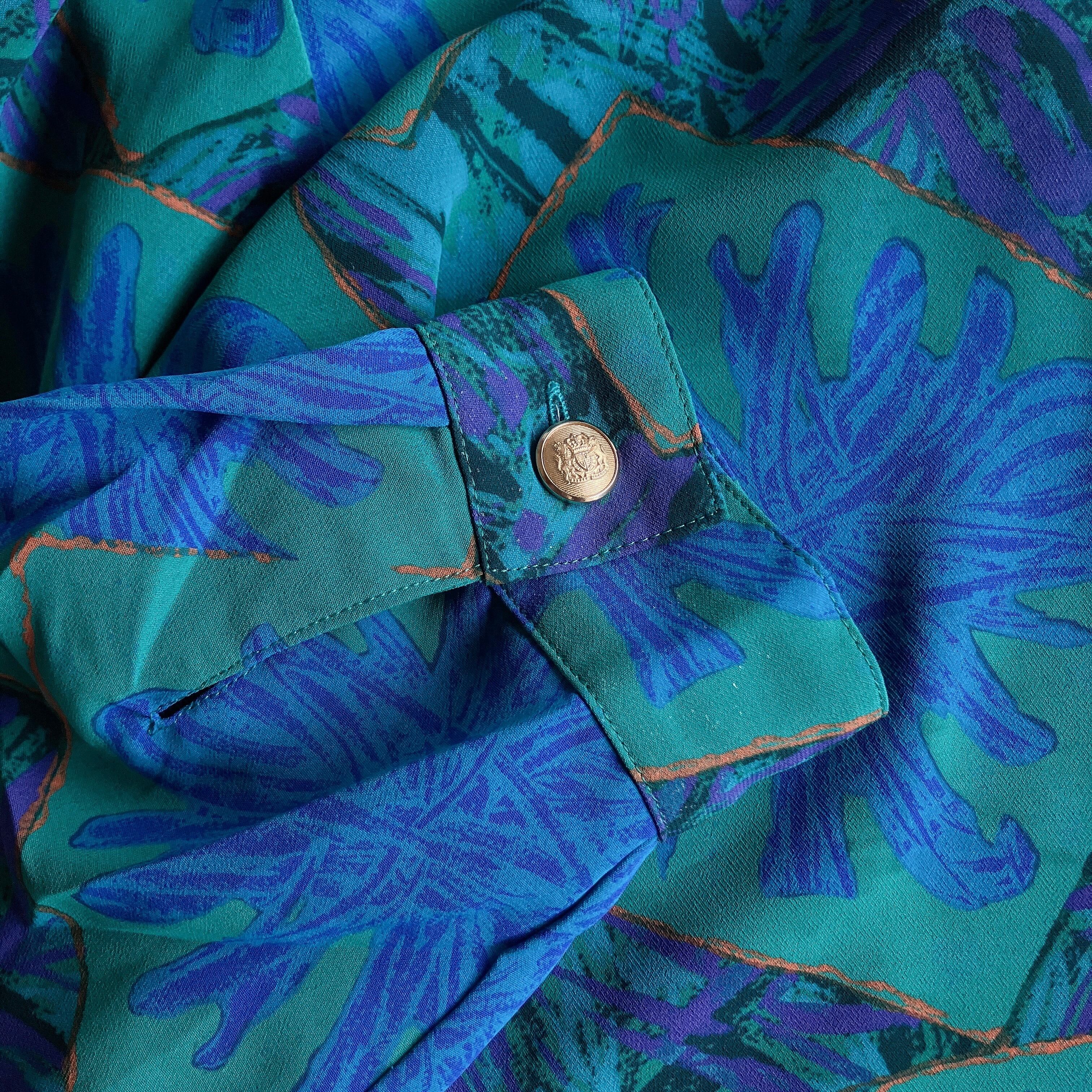 青緑の総柄ブラウスです。