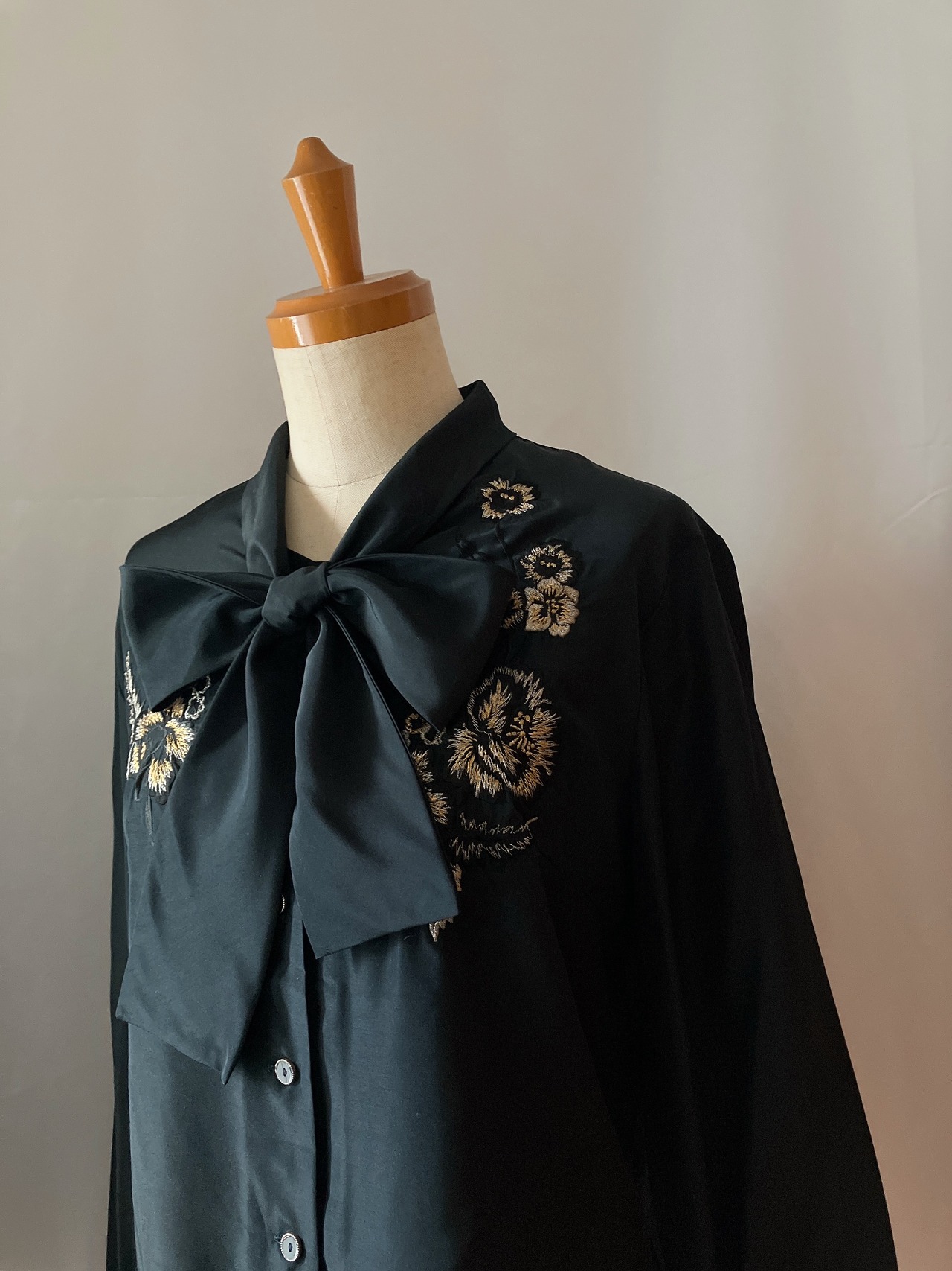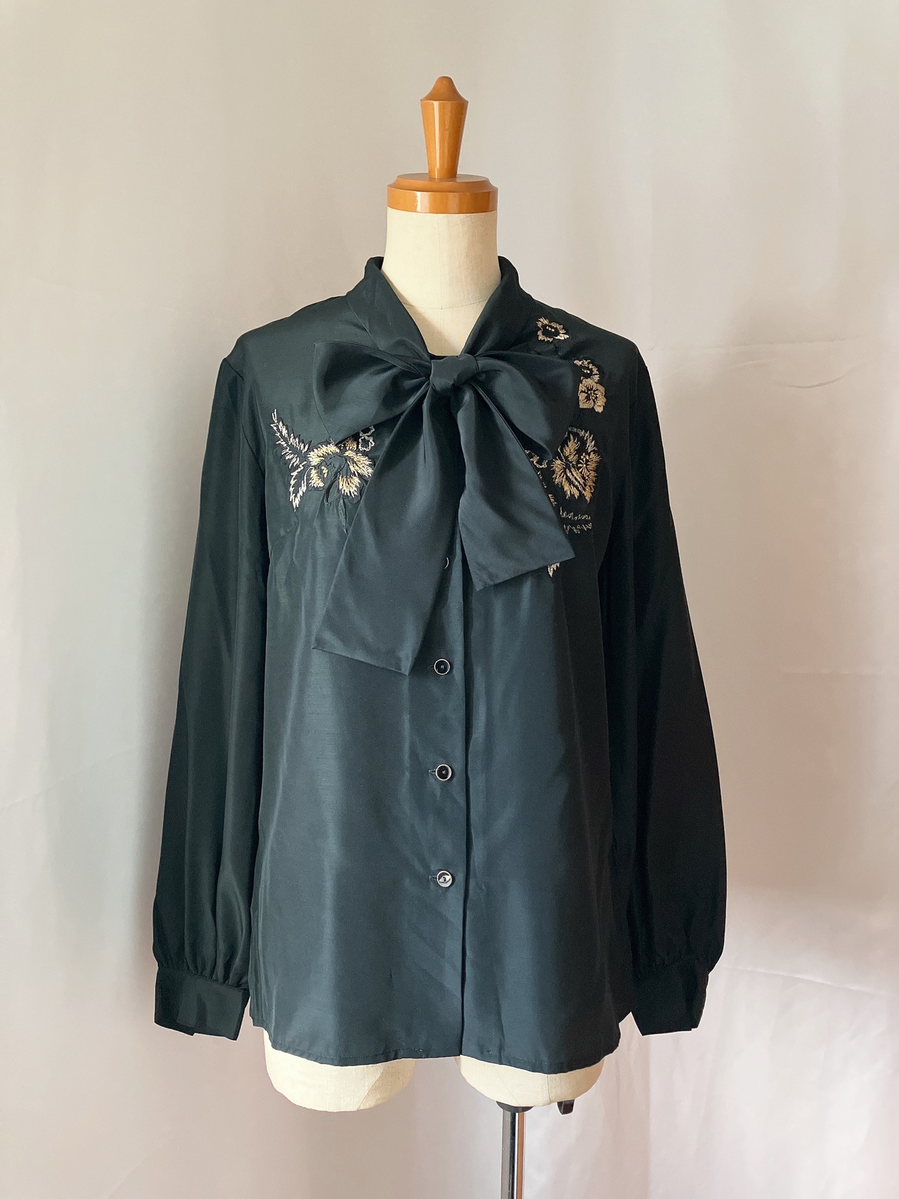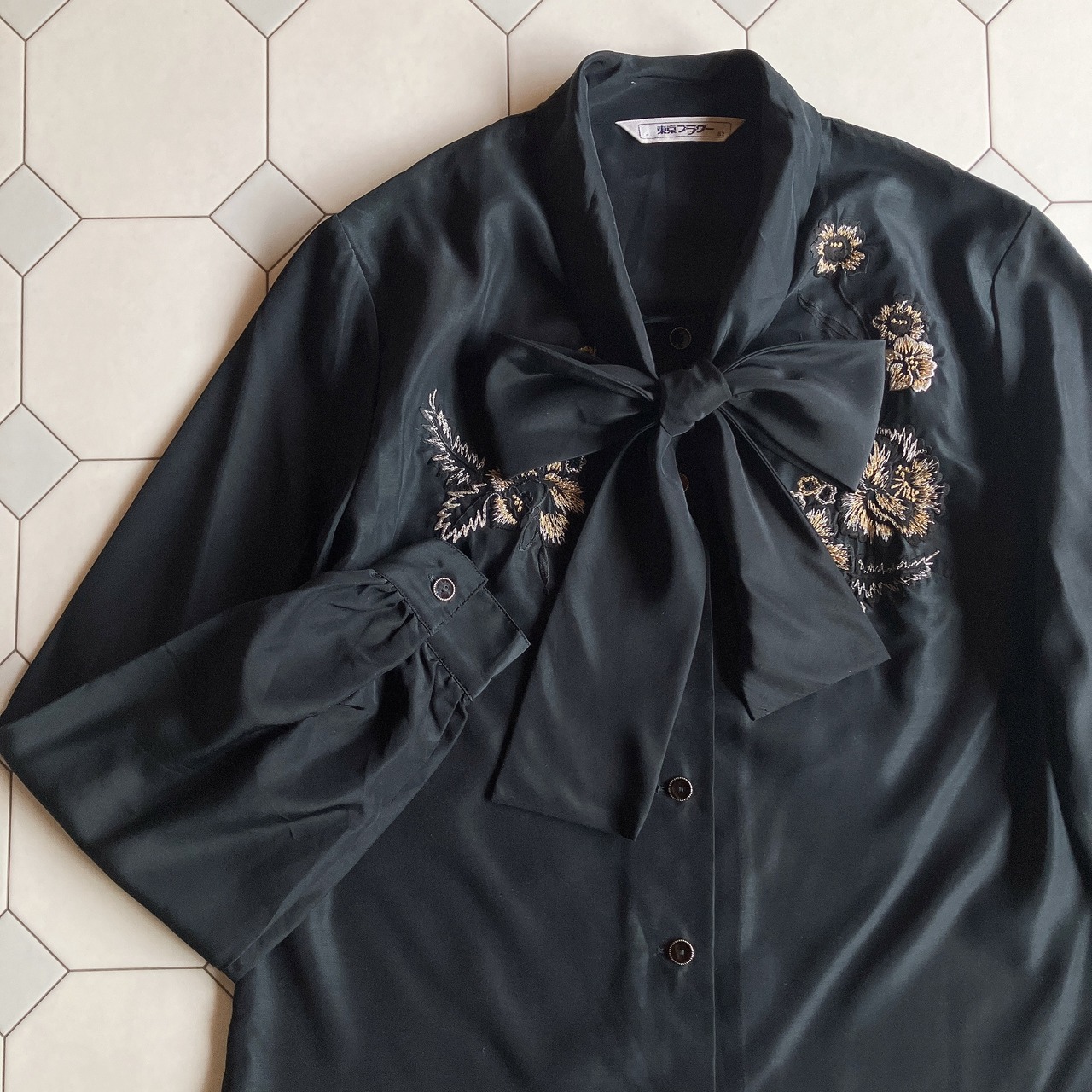 used レトロ 黒 リボンタイ ブラウス 古着 ヴィンテージ vintage